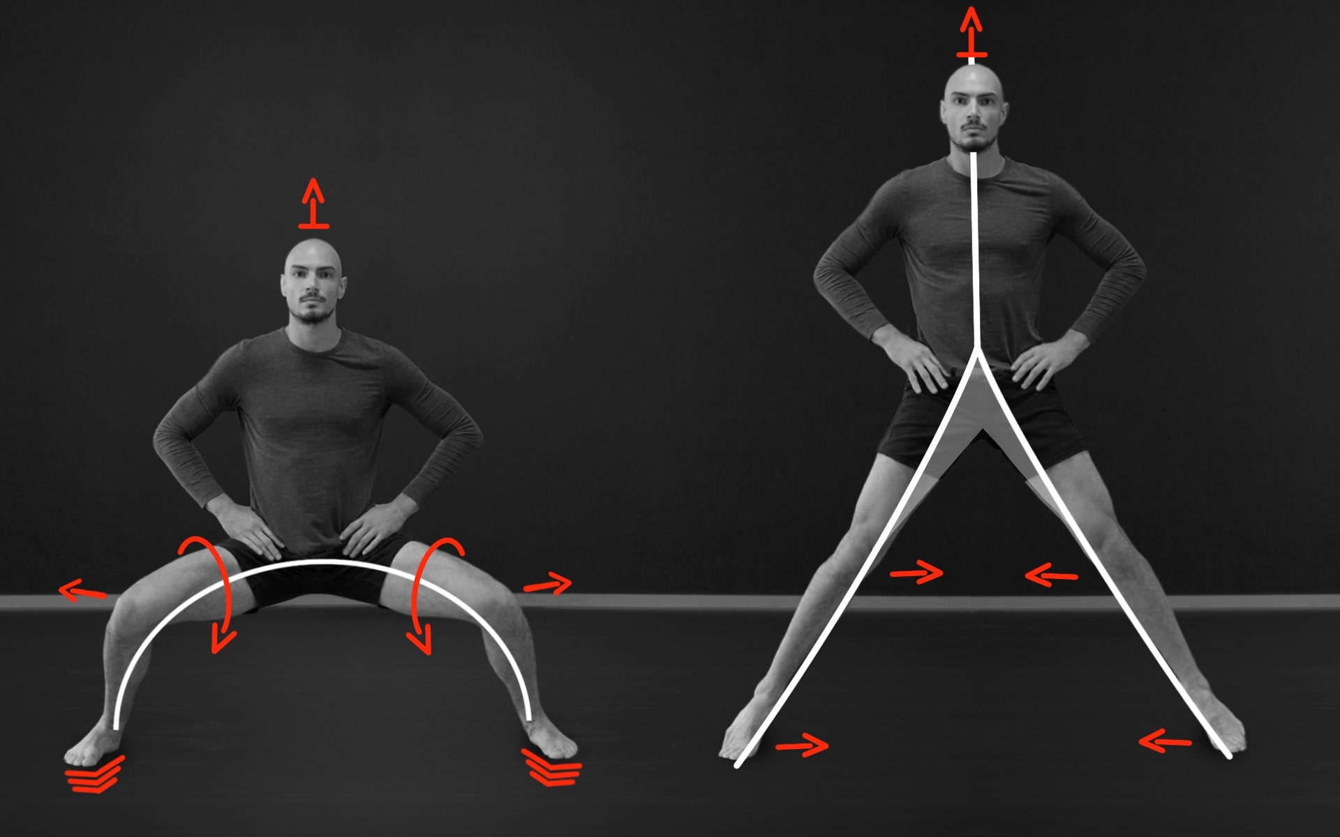 Zo vzpriamenej pozície s chodidlami pri sebe skĺzni dlaňami po predných stranách nôh tak, aby ľahko prekryli kolená, no neprenášaj váhu na ruky. Pohyb iniciuj tým, že obe kolená pošleš šikmo dopredu, čím vstúpiš do elipsy. Telo nech prirodzene nasleduje eliptický pohyb kolien, pričom bedrá, kolená a členky sa spoločne uvoľňujú do flexie. Päty sa môžu od zeme jemne odlepiť, no počas celého pohybu sa ich snaž tlačiť nadol, aby ostal aktívny zadný reťazec. Elipsy veď plynulo a kontrolovane po požadovaný počet opakovaní, tempo meň podľa potreby a následne zmeň smer.