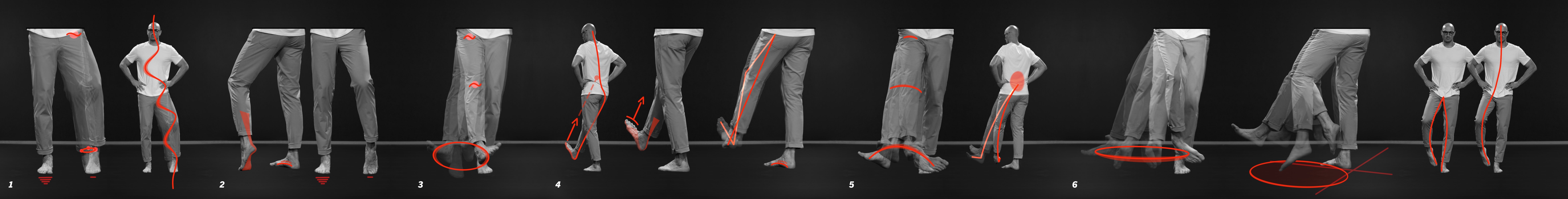- Synchronizácia: pri pohybe nadol/nahor sa bedrá, kolená aj členky zatvárajú/otvárajú súčasne